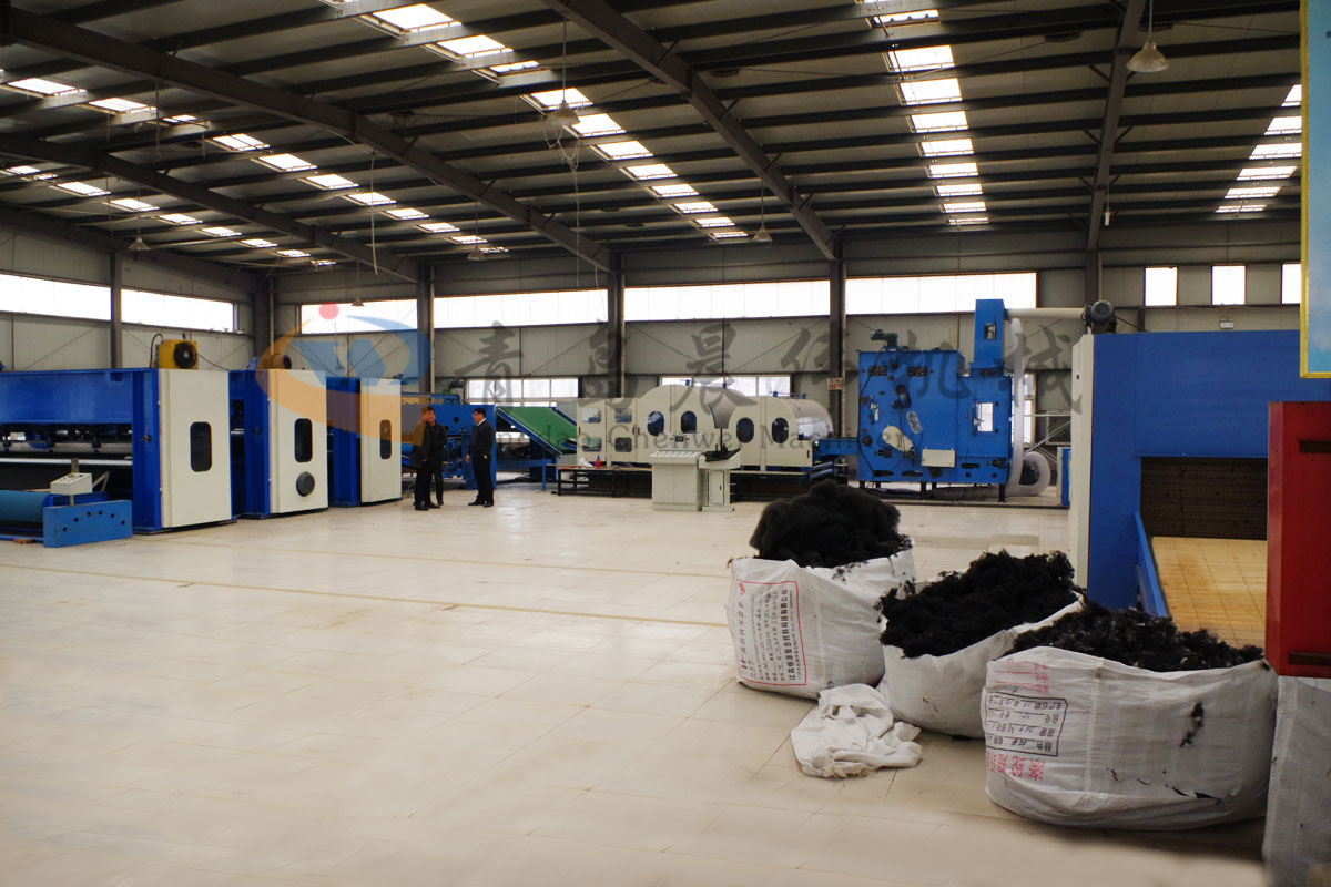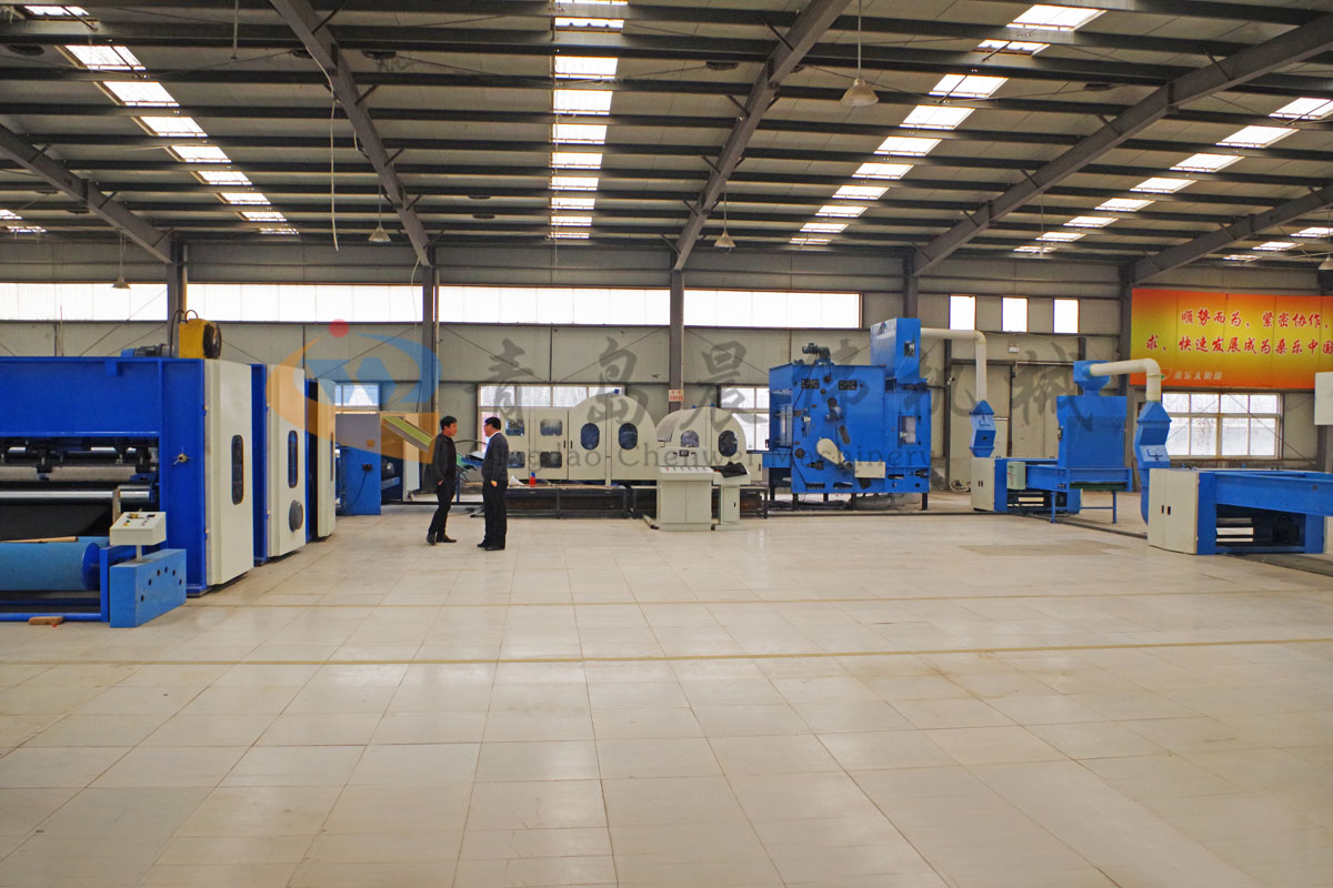 開包機(jī)-開松機(jī)-振動(dòng)給棉機(jī)-梳理機(jī)-鋪網(wǎng)機(jī)-針刺機(jī)-切邊成卷機(jī)