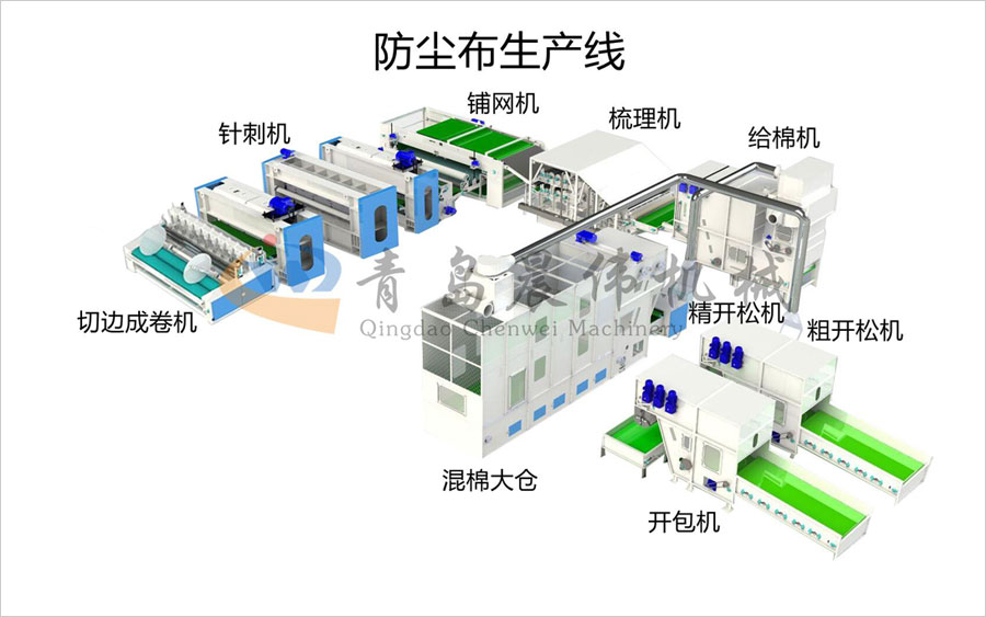 開包機(jī)-開松機(jī)-振動給棉機(jī)-梳理機(jī)-鋪網(wǎng)機(jī)-針刺機(jī)-切邊成卷機(jī)