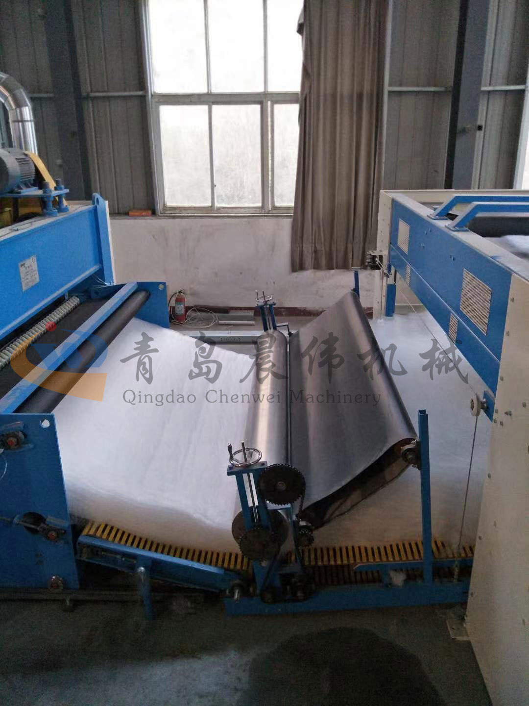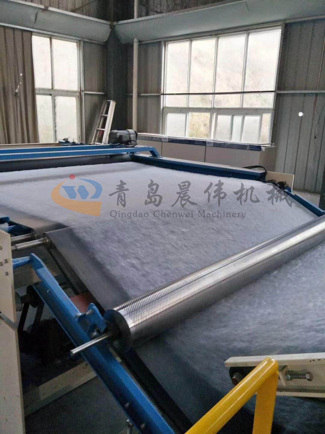 5. CWPW-鋪網(wǎng)機:用于將梳理纖網(wǎng)通過移動小車交叉折疊為所需幅寬和定量的多層纖網(wǎng),以供后道工序使用。鋪網(wǎng)輥采用特殊結(jié)構(gòu),加裝壓網(wǎng)輥和導流板,不飄網(wǎng)不起皺,五只大功率電機精確控制各部件的運動,電動輸出簾高度調(diào)節(jié)裝置